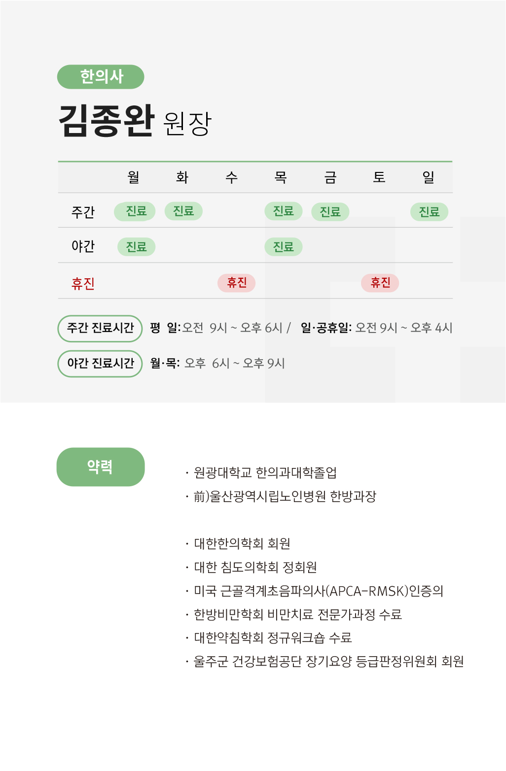 한의사 방태웅 병원장 자세히보기+ 한의사 김종완 원장 자세히보기+ 한의사 전정석 원장 자세히보기+ 한의사 임재은 원장 자세히보기+ 한의사 김민재 원장 자세히보기+ 한의사 박영하 원장 자세히보기+ 양방진료 박광순 원장 자세히보기+
